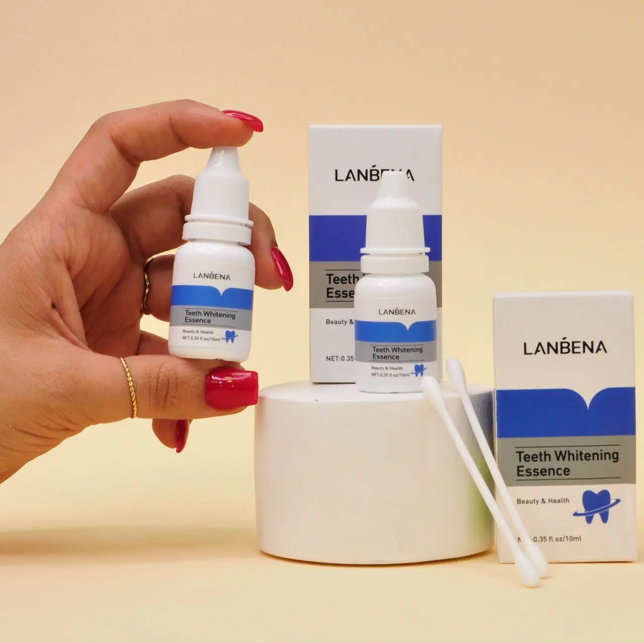 قبل از استفاده، حتما با آب گرم دهان خود را تمیز کنید. سپس با استفاده از گوش پاک کن مقداری از این محلول سفید کننده دندان لانبنا را به سطح دندان های خود بکشید. البته حتما جلوی آینه این کار انجام شود.